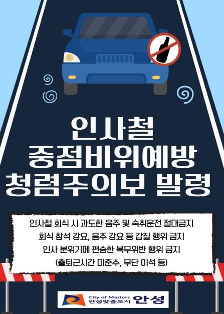 청렴주의보의 주요 내용으로는 △과도한 음주 및 숙취운전 절대 금지 △회식 및 음주 강요 등 갑질 행위 금지 △인사 분위기에 편승한 복무위반 행위 금지(출퇴근 시간 미준수, 무단 이석 등)이 있다.
