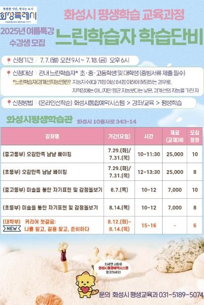 [경기경제신문] 화성특례시가 7일부터 오는 18일까지 2025년 느린학습자 학습단비 여름특강 수강생을 선착순 모집한다.