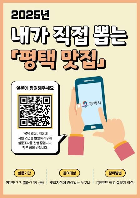 설문조사는 7월 7일부터 18일까지 2주간 온오프라인으로 진행되며, 온라인은 평택시청 누리집에 게시된 정보무늬(QR코드)를 통해 참여할 수 있고, 오프라인 참여를 희망하는 시민은 읍면동 행정복지센터를 방문하면 참여 가능하다.