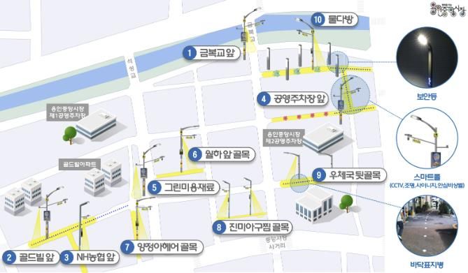주요 사업내용은 ▲보안등과 바닥표지병 ▲로고젝터 ▲비상시 관제센터와 연결하는 안심비상벨 ▲폐쇄회로(CC)TV 카메라·조명·디스플레이 일체형 스마트폴 등 골목 보행 환경과 안전에 필요한 시설물 설치다.