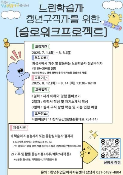 [경기경제신문] 화성특례시가 다음 달 8일까지 느린학습자 청년 구직자를 위한 ‘슬로워크프로젝트’에 참여할 교육생을 모집한다.
