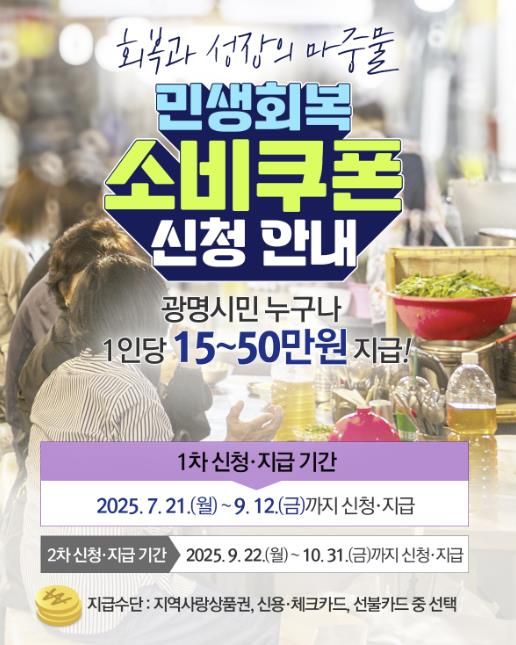 정부가 정한 6월 18일 주민등록 기준에 따르면, 광명시의 1차 민생회복 소비쿠폰 지급 대상은 28만 2천여 명이다. 오는 21일부터 신청이 가능하며, 신청 첫 주인 21일부터 25일까지는 출생 연도 끝자리에 따라 요일제를 적용한다. 출생 연도 끝자리가 1·6인 경우 월요일, 2·7인 경우 화요일, 3·8인 경우 수요일 4·9인 경우 목요일, 5·0인 경우 금요일에 신청 할 수 있다.