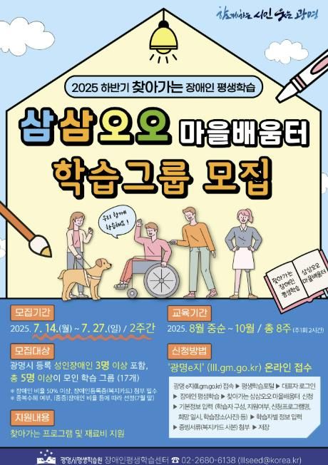 [경기경제신문] 광명시는 오는 14일부터 27일까지 이동에 제약이 있는 장애인을 위해 강사와 활동가가 직접 찾아가는 평생학습 프로그램 ‘삼삼오오 마을배움터’ 하반기 학습그룹을 모집한다.