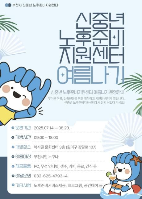 [경기경제신문] 부천시는 7월 14일부터 8월 29일까지 여름철 폭염에 대비해 시민의 건강한 여름나기를 지원하기 위해 ‘부천시 신중년노후준비지원센터’를 시원한 휴식 공간으로 개방한다.