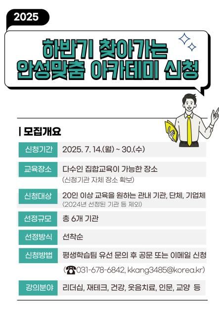 신청 기간은 오는 30일까지이며, 신청을 원하는 기관은 안성시 체육평생학습과 평생학습팀으로 유선 문의 후 공문 또는 이메일 을 통해 신청서를 제출하면 된다.