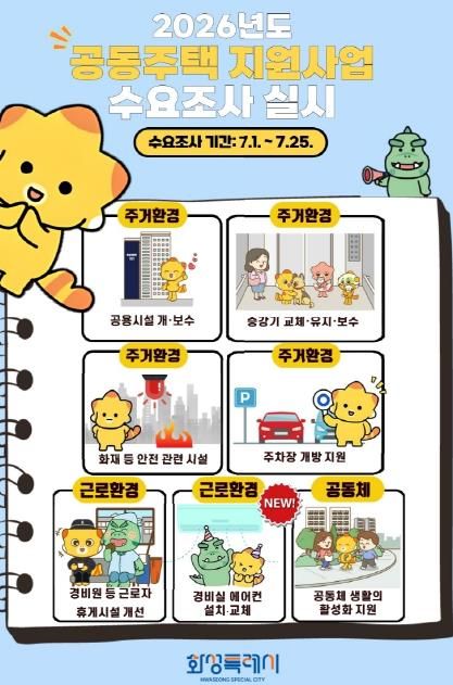 [경기경제신문] 화성특례시가 오는 25일까지 관내 공동주택을 대상으로 2026년도 공동주택 지원사업 추진을 위한 수요조사를 실시한다.