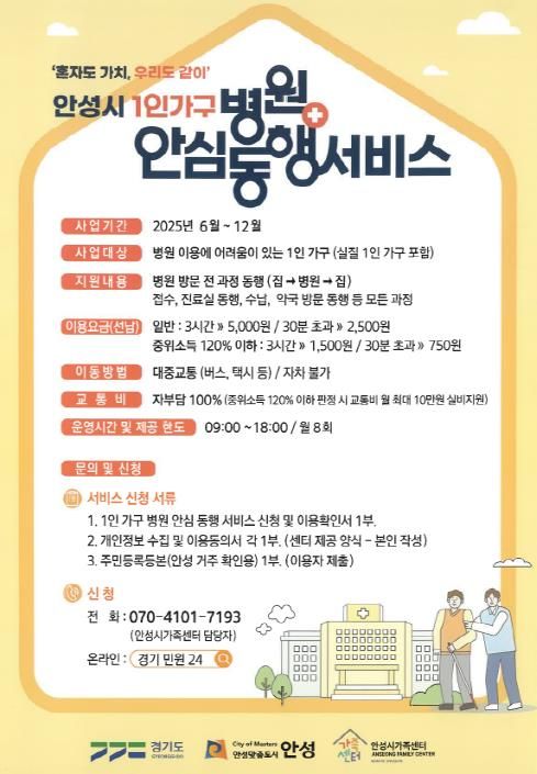 [경기경제신문] 2025년 7월 18일, 안성시는 혼자 병원 진료, 검사, 치료 등을 받기 어려운 1인 가구를 대상으로 ‘병원 안심 동행 서비스’를 본격적으로 시행하고 있다고 밝혔다.