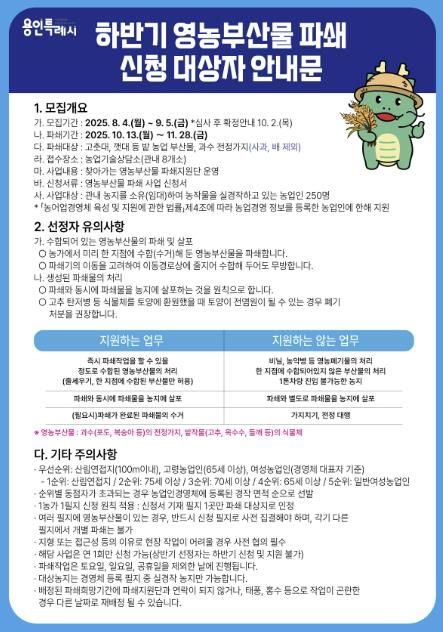 [경기경제신문] 용인특례시는 용인시농업기술센터에서 미세먼지 저감, 산불 예방, 병해충 발생 최소화를 위해 ‘2025년 하반기 영농부산물 안전처리 지원 사업’ 신청자를 모집한다고 29일 밝혔다.