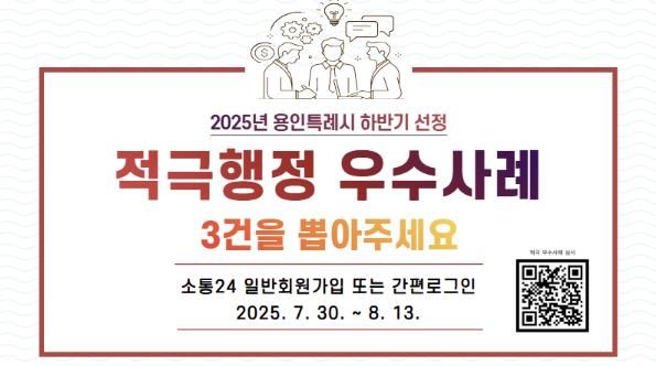 [경기경제신문] 용인특례시는 7월 30일부터 8월 13일까지 ‘2025년 하반기 적극행정 우수사례’ 선발을 위한 온라인 국민심사를 진행한다.