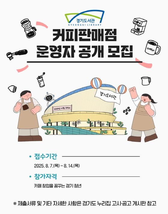 [경기경제신문] 경기도가 오는 10월 개관을 앞둔 경기도서관 내 커피 판매점의 운영자를 모집한다. 대상은 카페 창업을 꿈꾸는 경기 청년이며, 신청 기간은 8월 7일부터 14일까지다.
