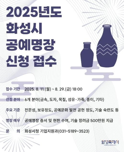 [경기경제신문] 화성특례시가 전통 공예 기술의 계승과 발전을 위해 2025년도 화성특례시 공예명장을 선발한다고 5일 밝혔다.