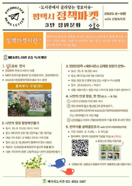 [경기경제신문] 평택시 도서관은 정책마켓을 통해 평택시 주요 부서의 시정 홍보 및 정책 정보를 시민에게 친근하게 전달하고 있다. 이번 8월~9월에는 푸른도시사업소 산림녹지과와 협업하여 『2025 평택시 정책마켓 3탄 – 정원문화』에 관한 정보를 제공한다.