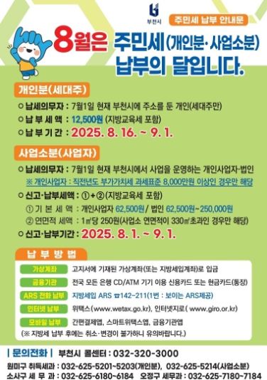 [경기경제신문] 부천시는 8월 ‘주민세 납부의 달’을 맞아 정기분 주민세 90억 원을 부과하고, 9월 1일까지 납부해줄 것을 안내했다. 과세 대상은 7월 1일 기준 부천시에 주소를 둔 세대주와 사업소를 둔 개인과 법인 사업자다.