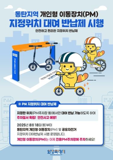 시범 운영은 동탄1동부터 동탄9동까지 전 지역에서 진행된다. 이용 시민은 반드시 PM 전용 주차장 등 지정된 위치에서만 대여·반납해야 하며, 이를 위반할 경우 추가 요금이 부과될 수 있다.