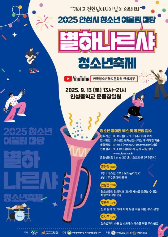 오는 9월 13일 오후 1시~밤 9시, 안성중학교 운동장 일원에서 열리는 ‘2025 안성시 청소년어울림마당 – 별하나르샤’는 청소년이 주인공이 되어 공연과 체험을 이끄는 참여형 문화축제다.