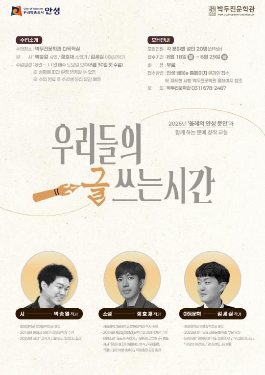 수업을 진행할 작가는 시집 『감자가 나를 보고 있었다』(문학동네)의 박승열 시인, 저서 『달과 바다가 아파하는 방식』, 단편소설 '도도새 죽이기' 등을 발표한 정호재 소설가, 단편동화 '떨어져 본 적도 없으면서!', '우리의 바다는' 등을 발표한 김세실 아동문학가로, 모두 2025년 ‘올해의 안성 문인’으로 선정된 신진 문인들이다.