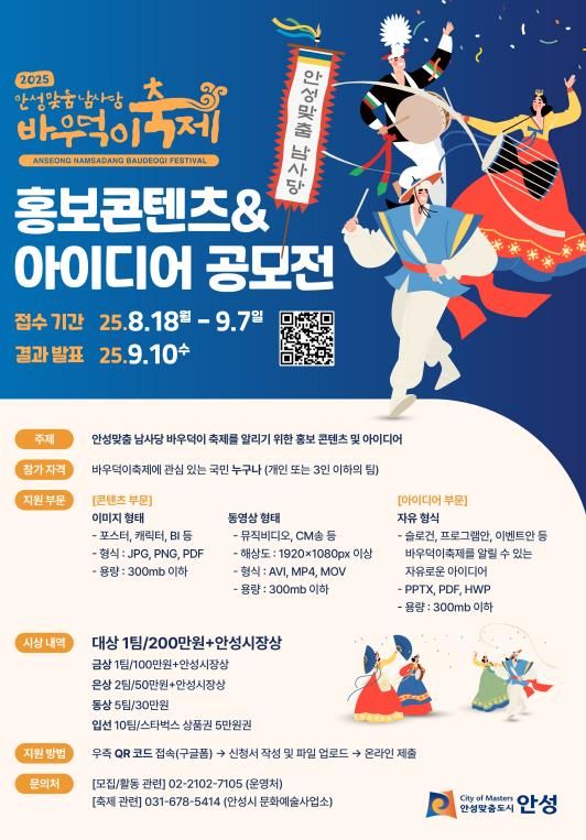 시청 관계자는“이번 2025 안성맞춤 남사당 바우덕이축제 공모전을 통해 많은 분들이 축제에 대한 관심을 갖고, 참신한 홍보 콘텐츠와 아이디어를 발굴하여 축제를 보다 재미있게 홍보할 수 있기를 기대한다”라고 말했다.