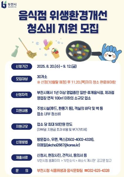 부천시 관계자는 “이번 청소비 지원을 통해 소규모 업소의 취약한 위생 공간을 집중적으로 개선할 수 있기를 바란다”며 “앞으로도 시민이 안심하고 찾을 수 있는 외식 환경 조성을 위해 꾸준히 힘쓰겠다”고 말했다.