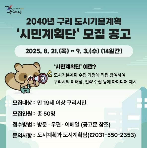 [경기경제신문] 구리시는 2040년 구리 도시기본계획 수립에 참여하여 구리시의 미래상과 전략 수립 등에 대한 계획 또는 의견을 제시하는 역할을 수행할 시민계획단을 8월 21일부터 9월 3일까지 모집한다.