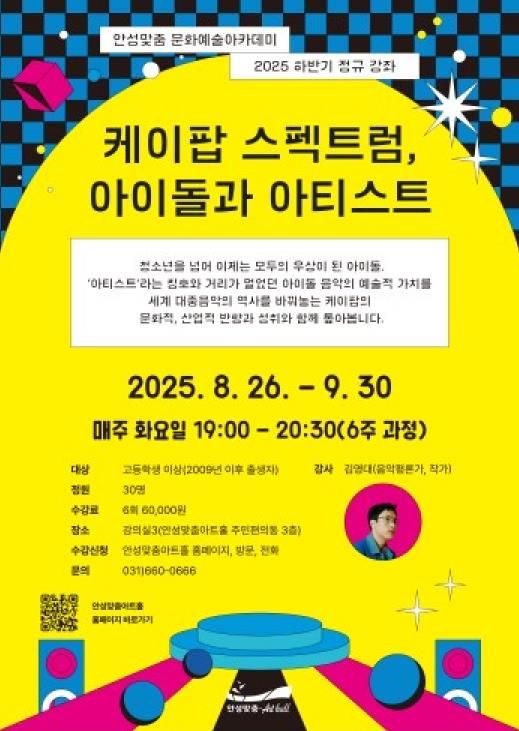 [경기경제신문] 안성맞춤아트홀에서는 오는 8월 26일부터 9월 30일까지 총 6주간 시민을 위한 문화예술 아카데미 '케이팝 스펙트럼, 아이돌과 아티스트'를 운영한다.