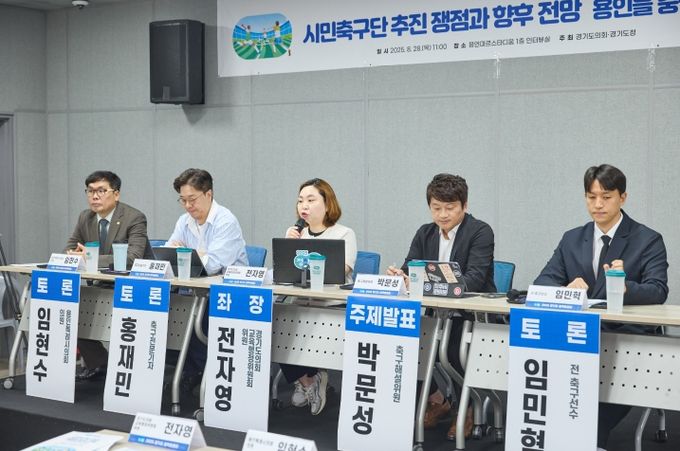[경기경제신문] 경기도의회 교육행정위원회 전자영 의원(더불어민주당, 용인4)이 좌장을 맡은 '시민축구단 추진 쟁점과 향후 전망 – 용인을 중심으로' 정책토론회가 28일 용인미르스타움에서 성황리에 개최됐다. 이번 토론회는 경기도와 경기도의회가 공동 주최한 ‘2025 경기도 정책토론회’의 일환으로 마련됐다.