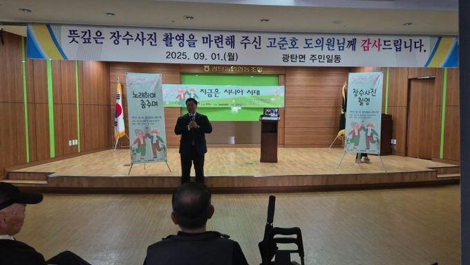 앞서 고준호 의원은 1일(월) 광탄면 촬영 현장을 찾아 어르신들을 격려했다. 현장에는 ‘뜻깊은 장수사진 촬영을 마련해주신 고준호 도의원님께 감사드립니다’라는 문구가 적힌 현수막이 내걸려 있었고, 이를 본 고 의원은 “오히려 제가 더 감사하다”며 감동을 전했다.