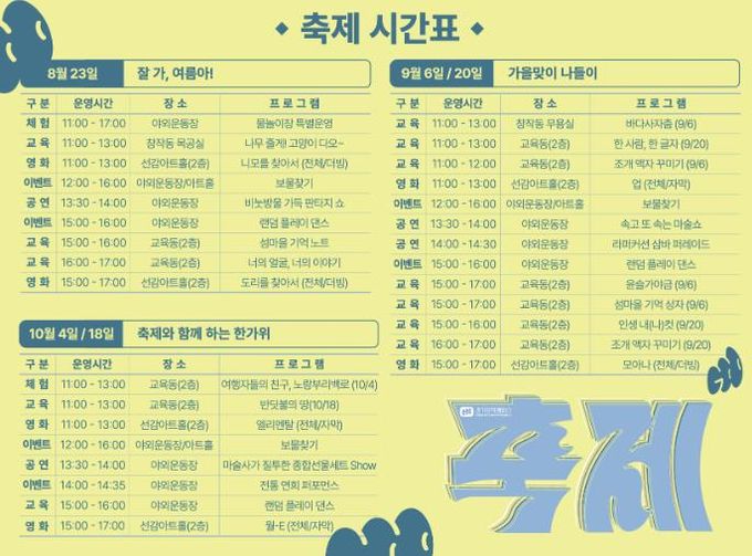 지난 8월 23일 열린 1회차 ‘축제’가 워터파크형 물놀이와 캠크닉, 다양한 예술 교육 프로그램으로 참여한 가족 방문객들이 여름의 끝자락을 시원하게 즐길 수 있는 하루를 선사했다면, 가을을 맞아 열리는 9월 축제는 풍성한 계절에 어울리는 퍼레이드 공연과 함께한다.