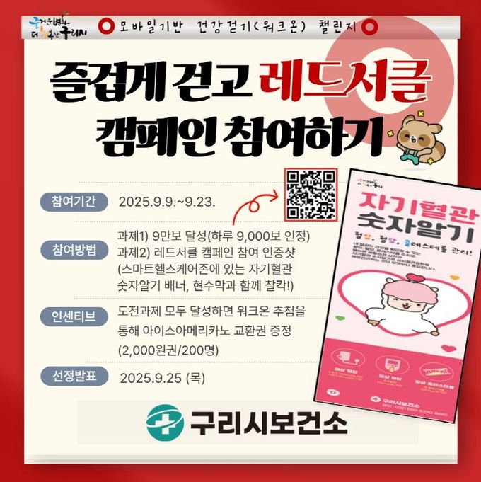참여를 원하는 사람은 워크온 앱 설치하여 구리시 공식커뮤니티‘즐거운 걷기, 더 행복한 건강생활' 커뮤니티 가입 후 챌린지 기간 9만보의 걸음 수를 달성함과 동시에 레드서클 캠페인 참여 인증사진(‘자기혈관 숫자알기’ 배너 또는 현수막 인증사진)을 게시하면 되며, 구리 시민을 대상으로 미션을 달성한 참가자 중 추첨을 통해 200명에게 모바일 음료 쿠폰이 제공된다.