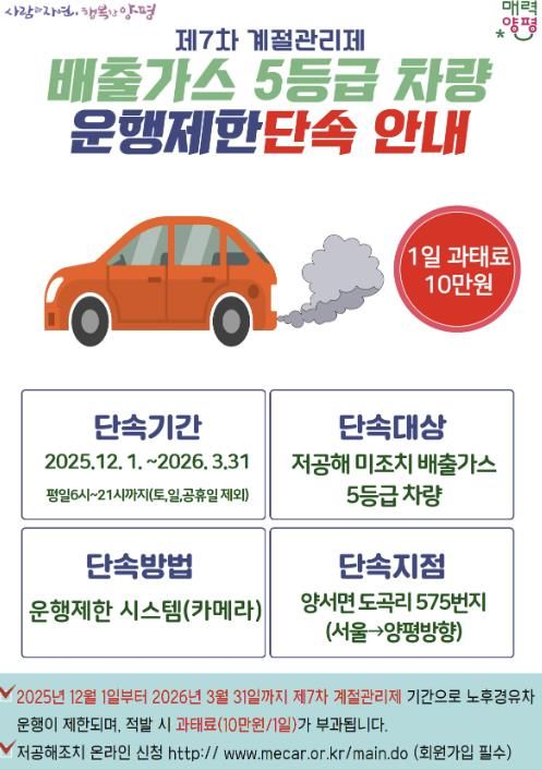 [경기경제신문] 양평군(은 오는 12월 1일부터 2026년 3월 31일까지 제7차 미세먼지 계절 관리제 시행에 따라 배출가스 5등급 차량에 대한 운행 제한 단속을 시행한다고 밝혔다.