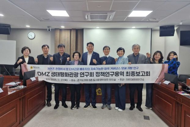 [경기경제신문] 경기도의회 의원연구단체인 DMZ생태평화관광 연구회(회장 오준환 의원)는 지난 27일 경기도의회 도시환경위원회 회의실에서 '커먼즈 관점에서 본 DMZ와 배후지의 지속가능한 협력 거버넌스 모델 개발 연구' 용역 최종보고회를 개최했다.