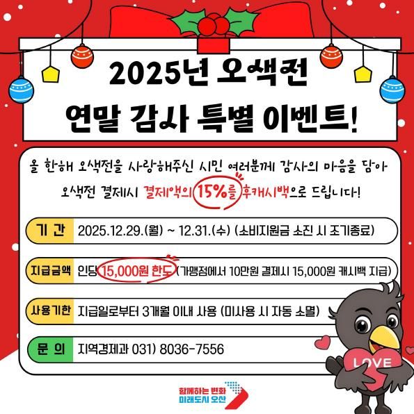 [경기경제신문] 오산시는 한 해 동안 지역화폐를 이용해 준 시민들에게 감사의 뜻을 전하고, 연말 소비 활성화를 도모하기 위해 ‘2025년 오색전 연말 감사 특별 이벤트’를 추진한다.
