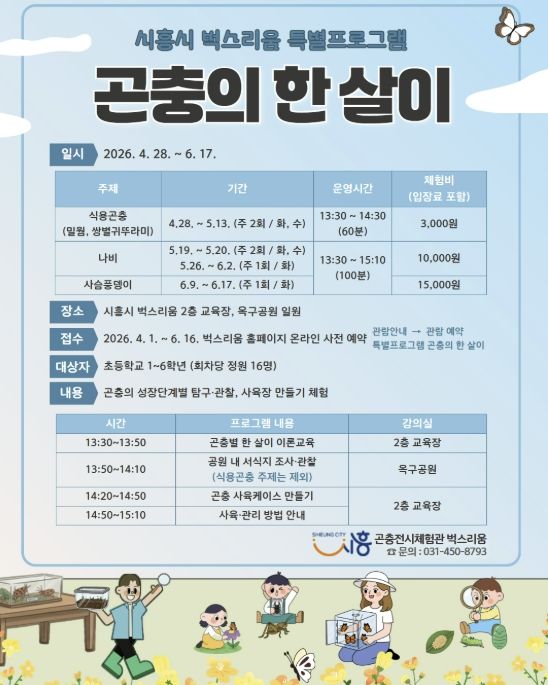 [경기경제신문] 시흥시 곤충체험전시관 ‘벅스리움’은 오는 4월 28일부터 6월 17일까지 초등학생을 대상으로 특별프로그램 ‘곤충의 한 살이’를 운영한다.
