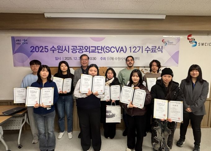 [경기경제신문] 수원시국제교류센터가 22일 센터에서 ‘수원시 공공외교단(SCVA) 12기’ 수료식을 열고, 단원 16명에게 수료증을 전달했다. 우수활동자 4명에게는 상장을 수여했다.