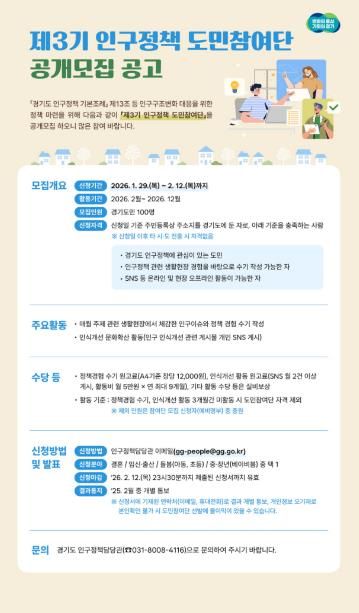 [경기경제신문] 경기도가 정책 대상자가 직접 정책개선에 참여하는 ‘제3기 인구정책 도민참여단’ 100명을 공개 모집한다.