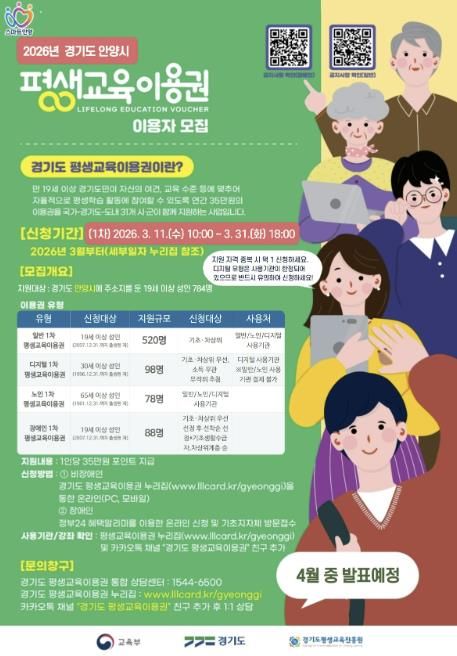 [경기경제신문] 안양시는 저소득층, 어르신, 장애인 등 교육 취약계층의 평생학습 기회를 보장하기 위한 총 3억 원 규모의 ‘2026년 평생교육 이용권(바우처) 지원사업’을 추진한다고 11일 밝혔다.
